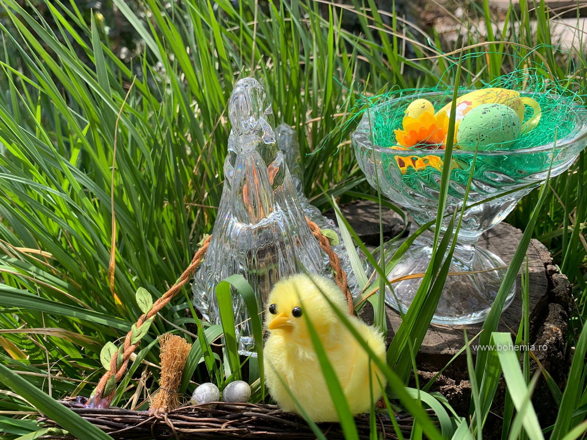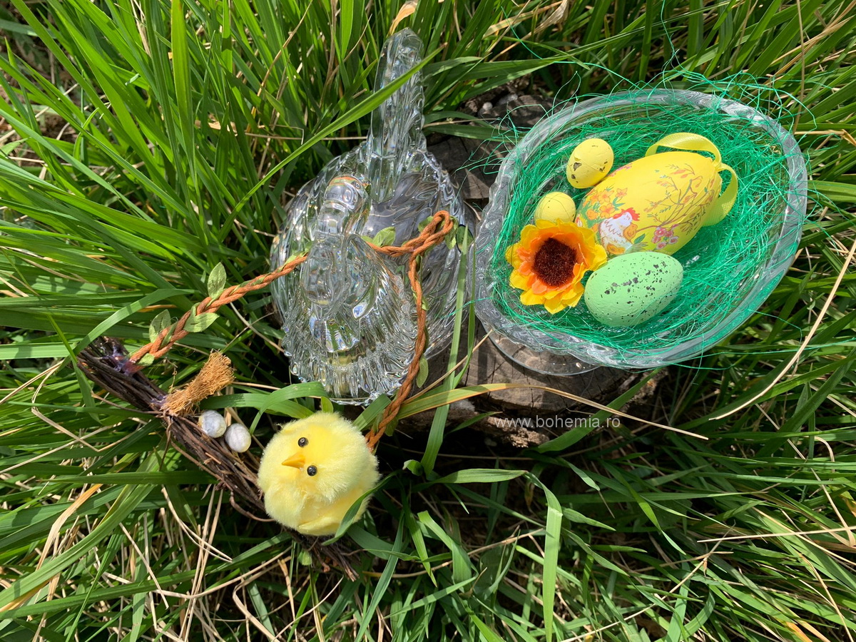 Ascunde un aranjament de Paste colorat, iar puiul care atarna pe cracuta sprijinita de capac da o nota vesela.