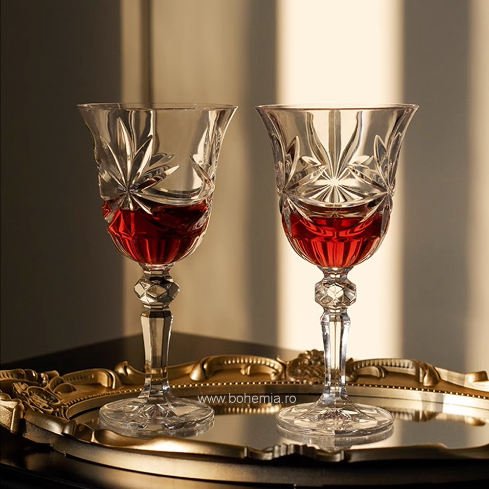 Piciorul elaborat, cu o bulina fatetata ce reflecta lumina in tuse blande, adauga gratie fiecarui pahar. Sunt pahare care nu doar insotesc o masa, ci o imbraca in rafinament.