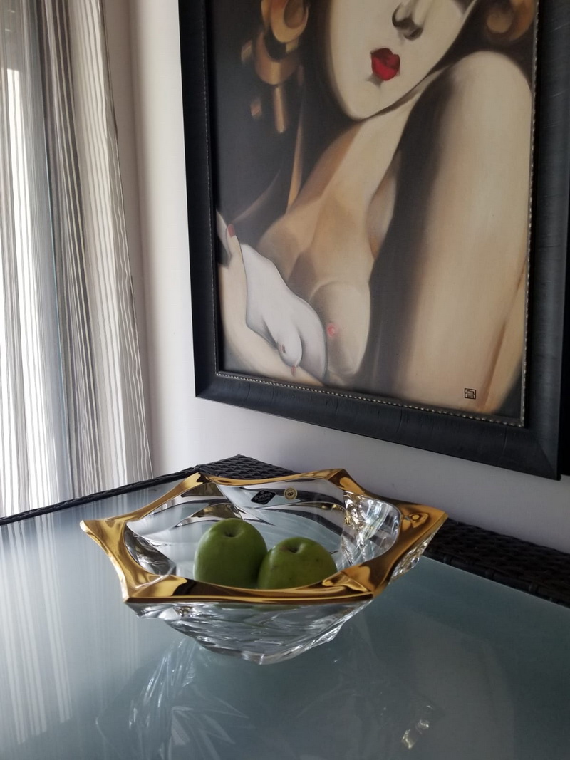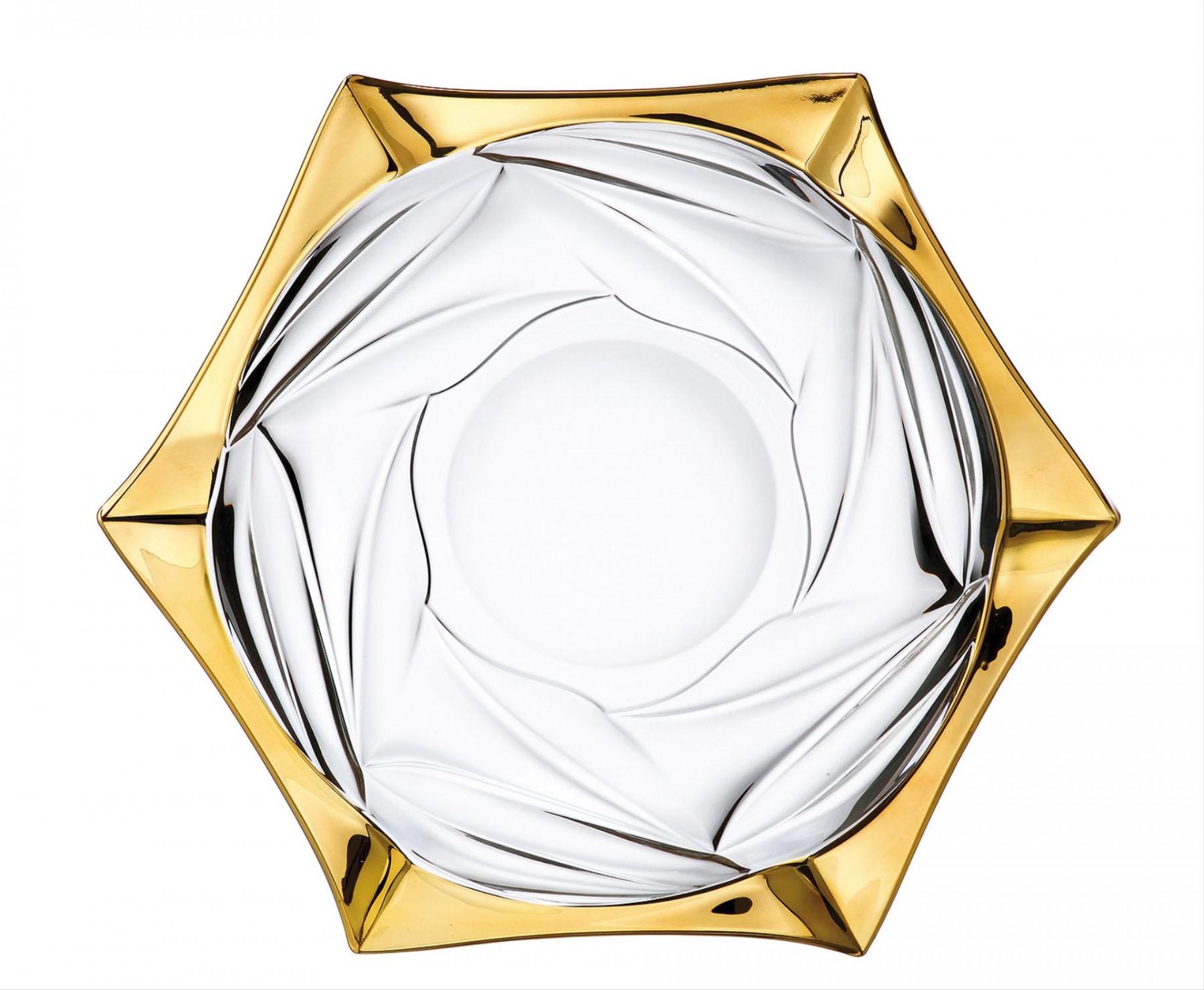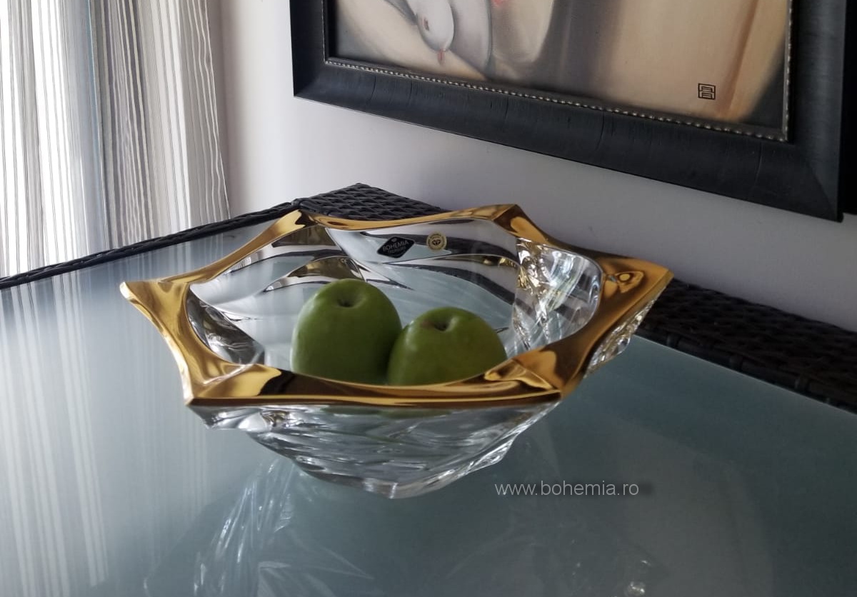 Fructiera cu unduiri moderne, de dimensiune mare, cu decor nobil si ambalaj deosebit, produsa de compania Bohemia Treasury. Decorul auriu este elegant si subtil.