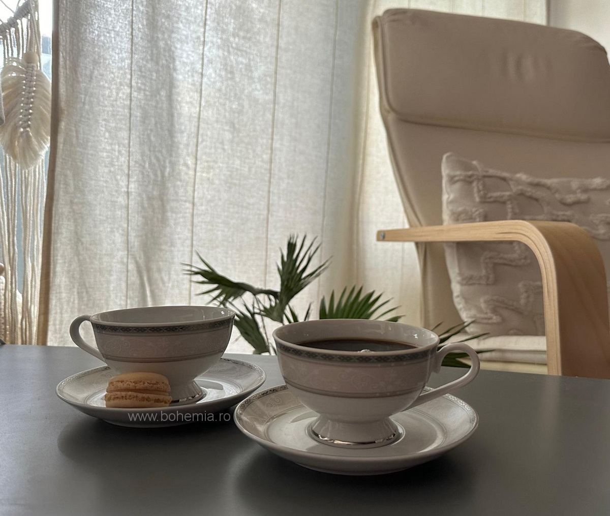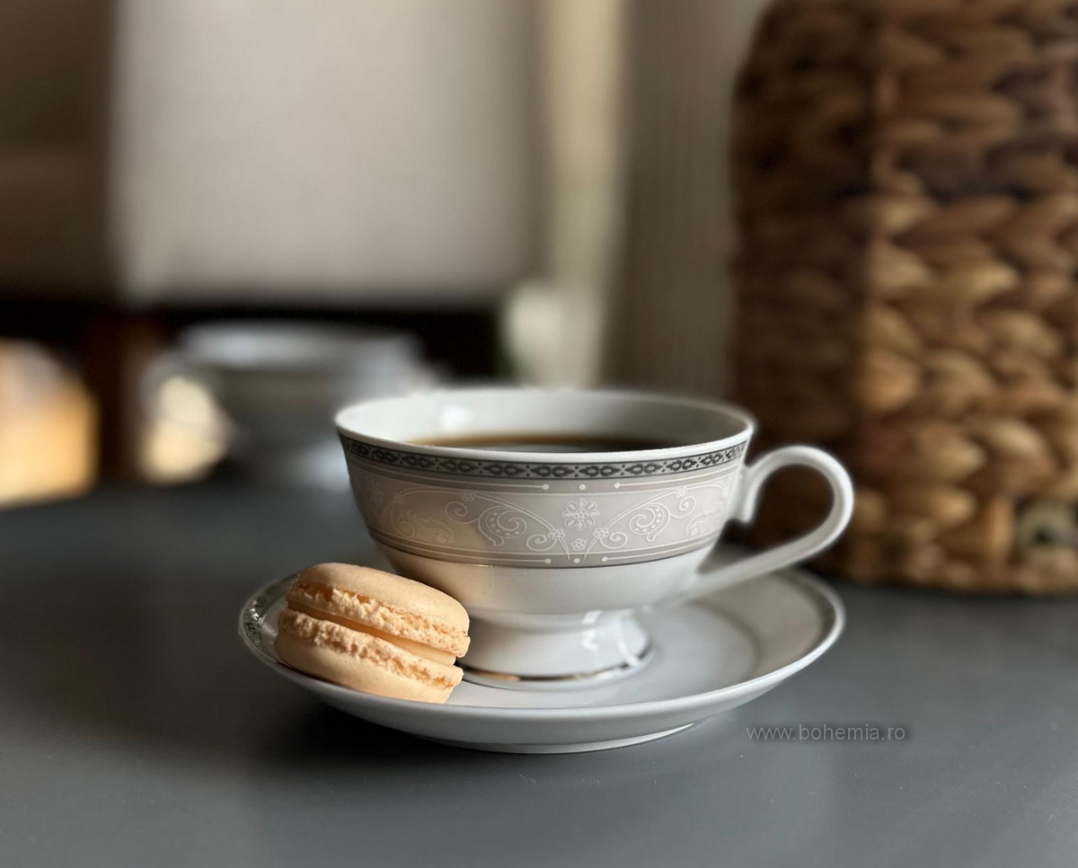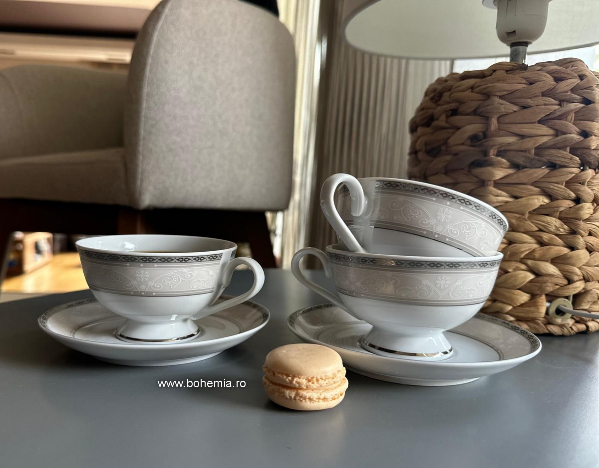 Setul contine 6 cescute cu capacitatea de 220 ml. si 6 farfuriute asortate. Decorul bej, bordura argintie, forma deosebita si portelanul de foarte buna calitate, fac din acest set un cadou deosebit de apreciat!