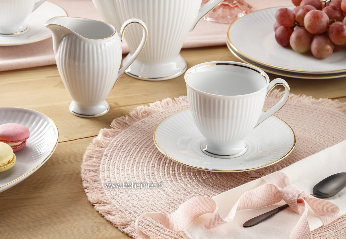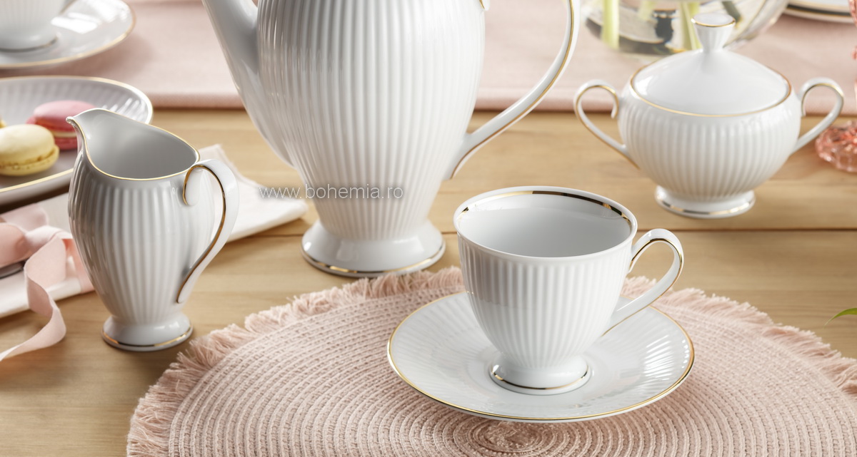 Set pentru cafea din portelan fin care contine 6 cescute cu capacitatea de 250 ml, 6 farfuriute asortate, 1 zaharnita cu capac si 1 latiera.