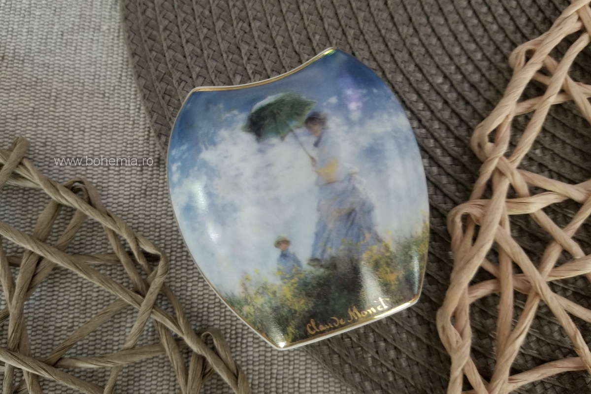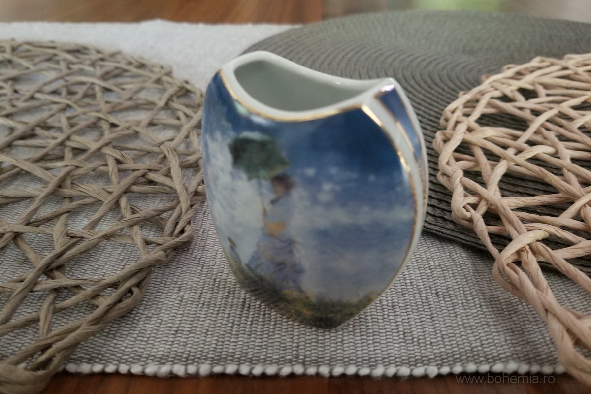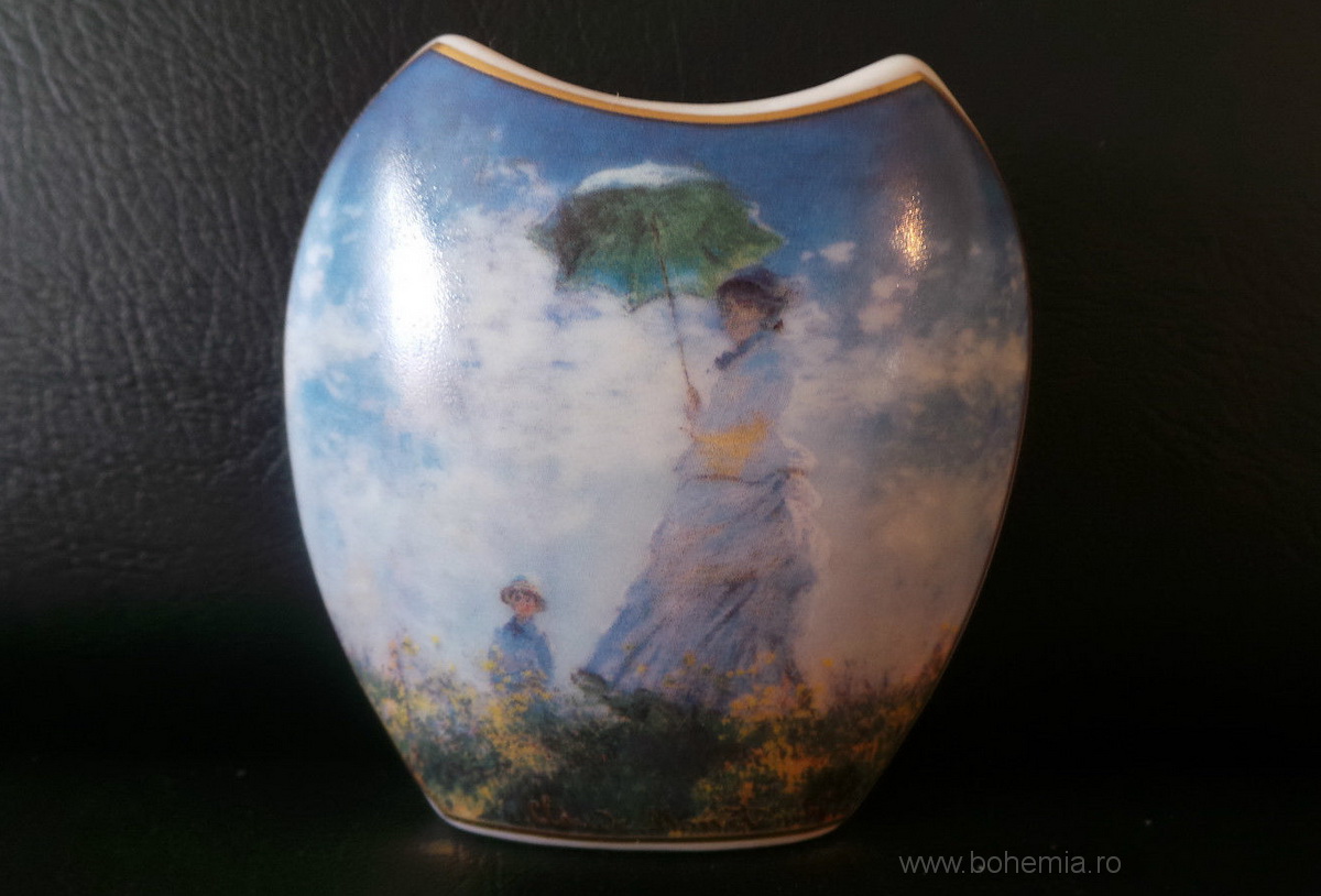 Vazuta din portelan, avand ca decor reproducerea tabloului lui Claude Monet - Femeia cu umbrela de soare.