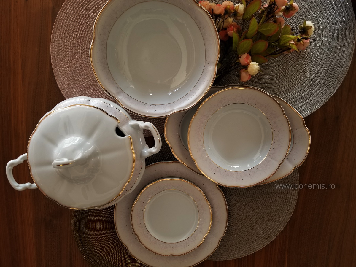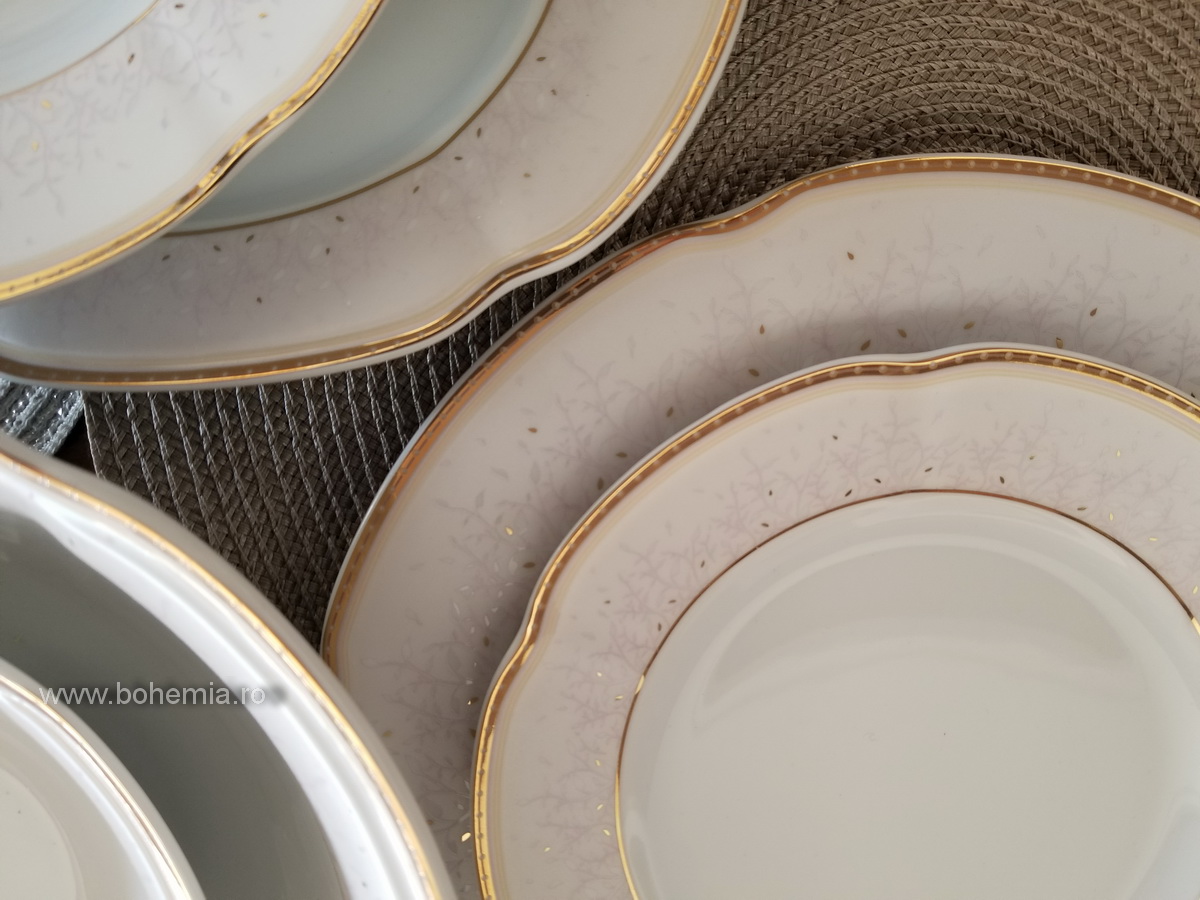 Serviciu de masa din portelan fin, cu bordura feminin ondulata, marca Chodziez - Polonia. Se caracterizeaza printr-un model cu crengute si frunzulite albe si aurii pe un fond uimitor roz prafuit, extrem de feminin si delicat.