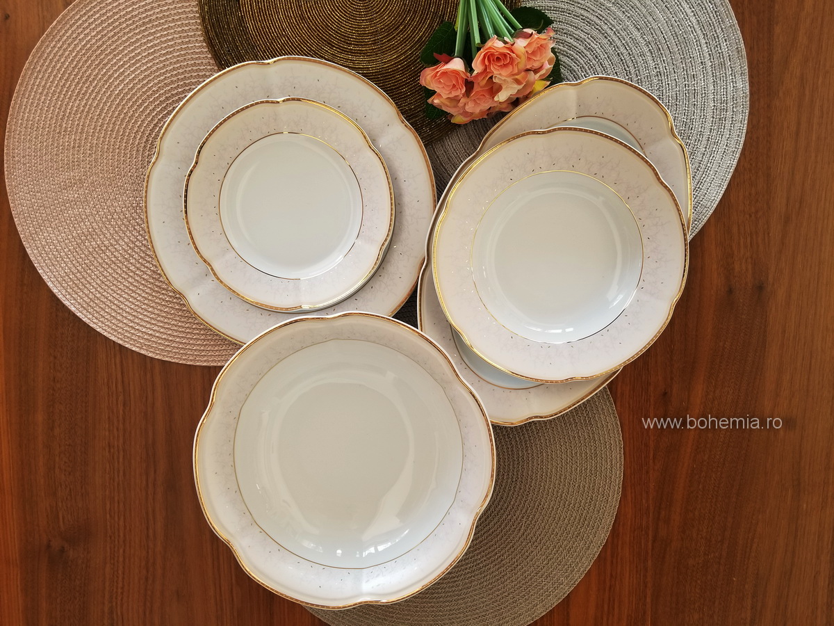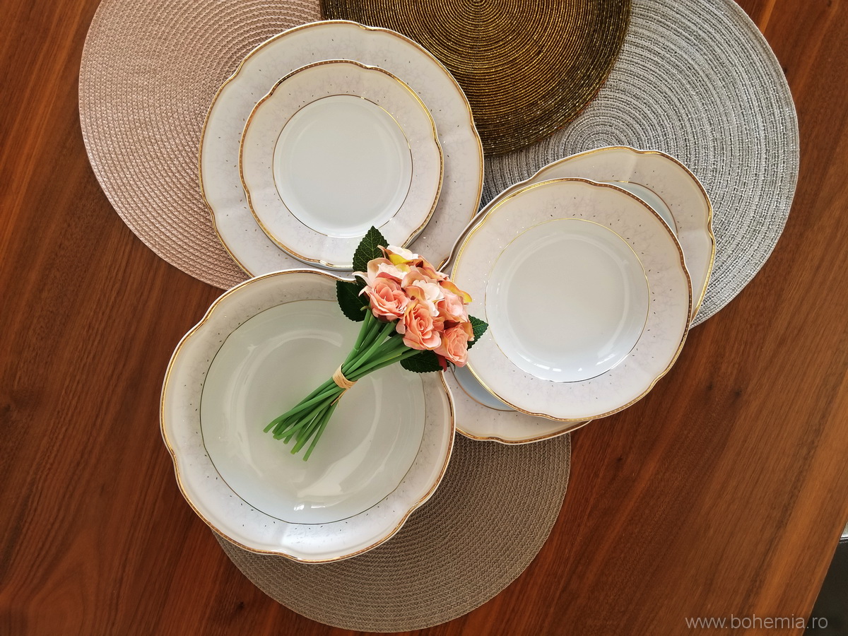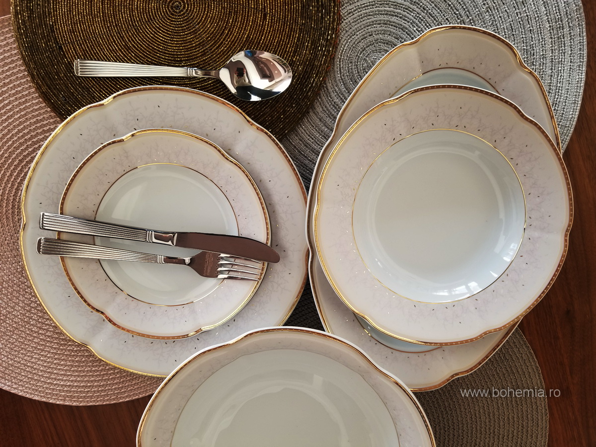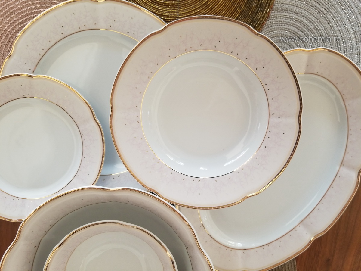 Serviciu de masa din portelan fin, cu bordura feminin ondulata, marca Chodziez - Polonia. Se caracterizeaza printr-un model cu crengute si frunzulite albe si aurii pe un fond uimitor roz prafuit, extrem de feminin si delicat.