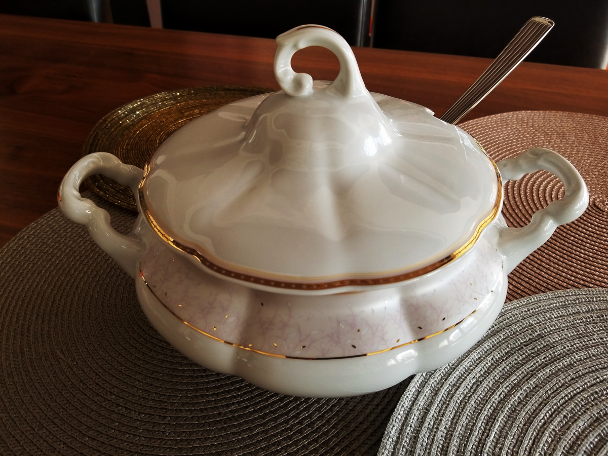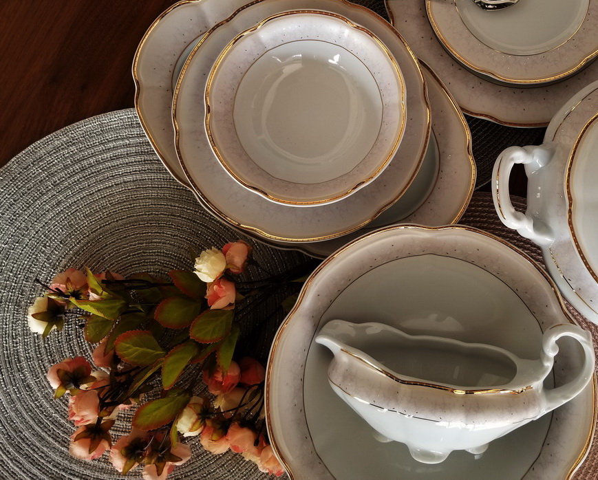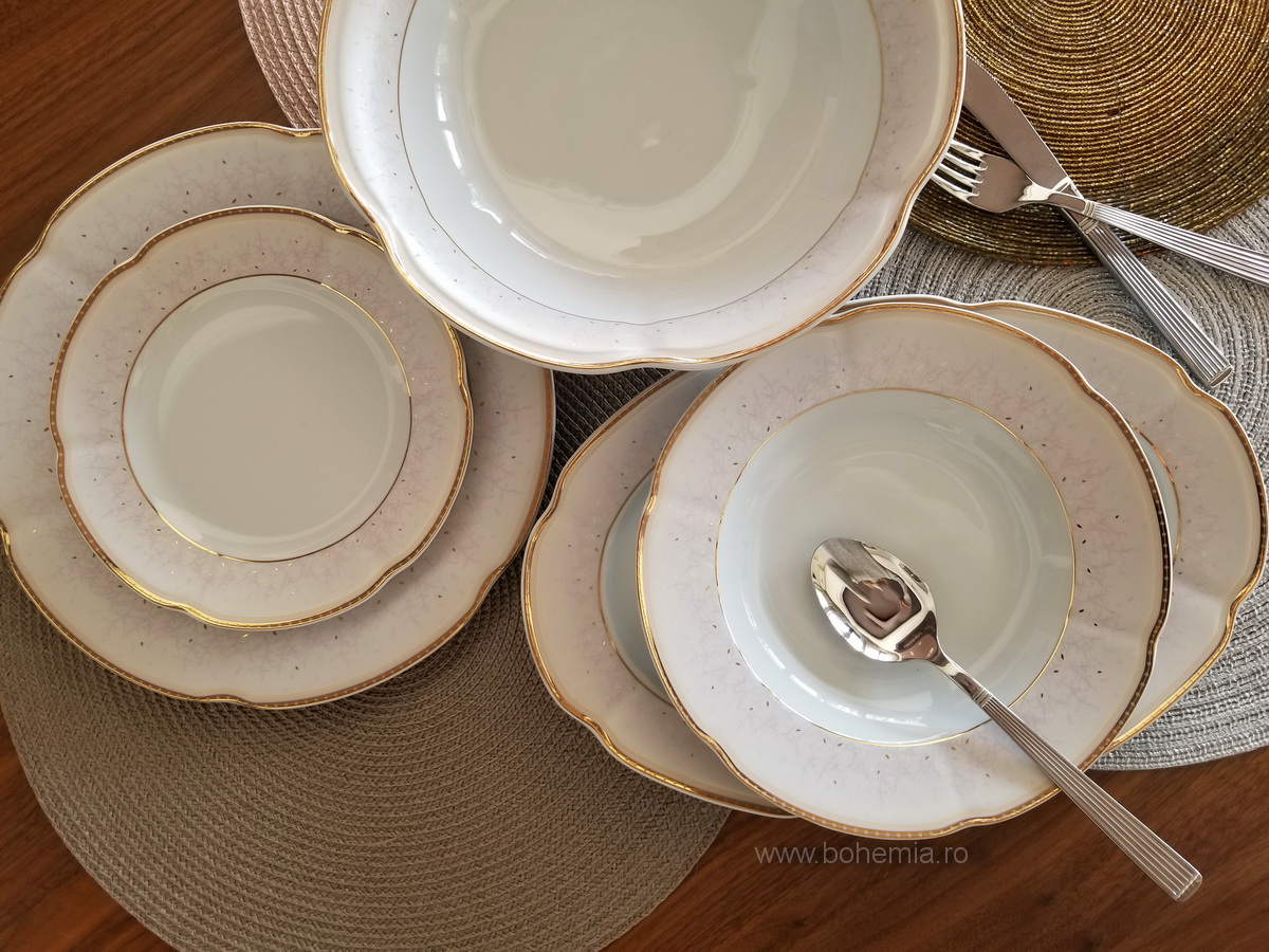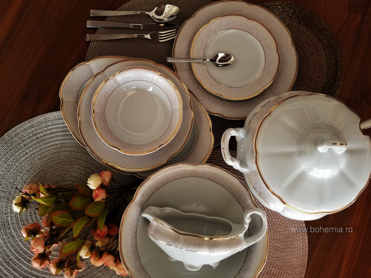 Serviciu de masa din portelan fin, cu bordura feminin ondulata, marca Chodziez - Polonia. Se caracterizeaza printr-un model cu crengute si frunzulite albe si aurii pe un fond uimitor roz prafuit, extrem de feminin si delicat.