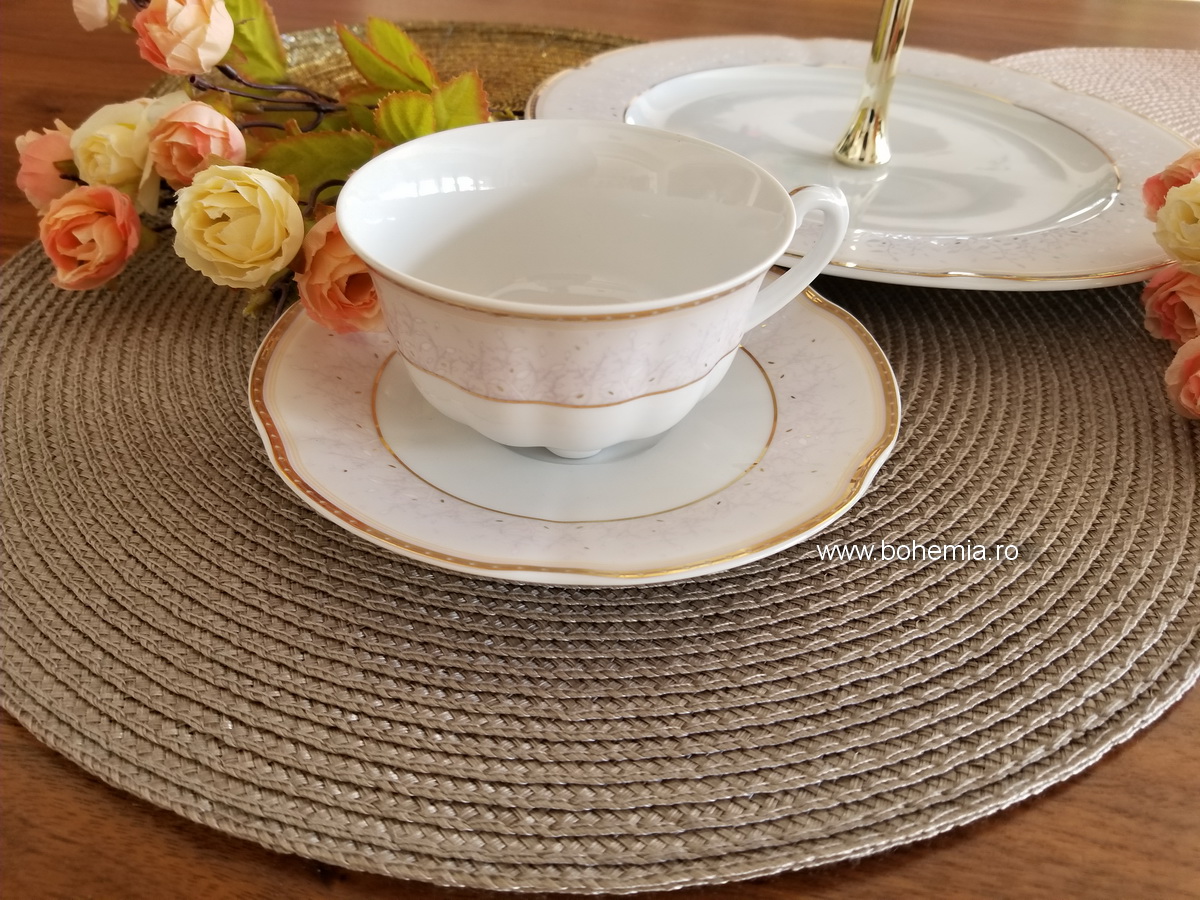 Cu un decor suav avand crengute si frunze albe si aurii cazand in ploaie fina pe fondul roz prafuit, acest set este o incantare!