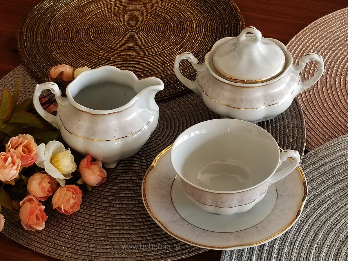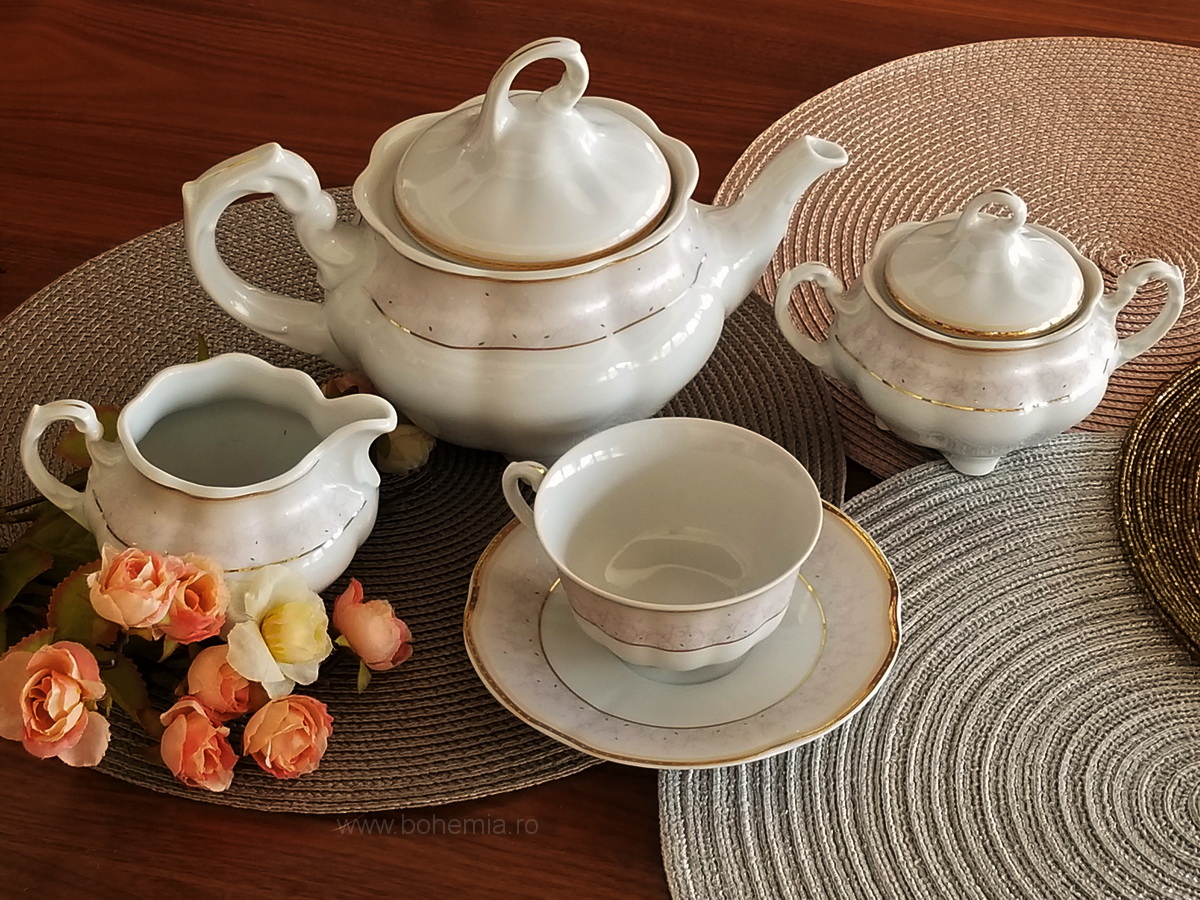Setul contine 6 cescute cu capacitatea de 220 ml si 6 farfuriute asortate, o zaharnita de 300 ml, o latiera de 350 ml si un recipient pentru ceai/cafea, de 1.1 litri.