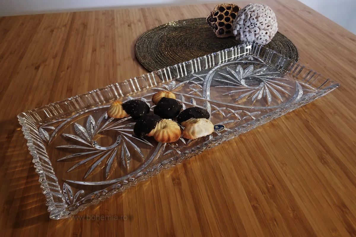 Platou dreptunghiular din cristal, elegant si versatil, ideal pentru servirea prajiturilor, dar si ca tava pentru asezarea cestilor de cafea sau a paharelor in momentele speciale.
