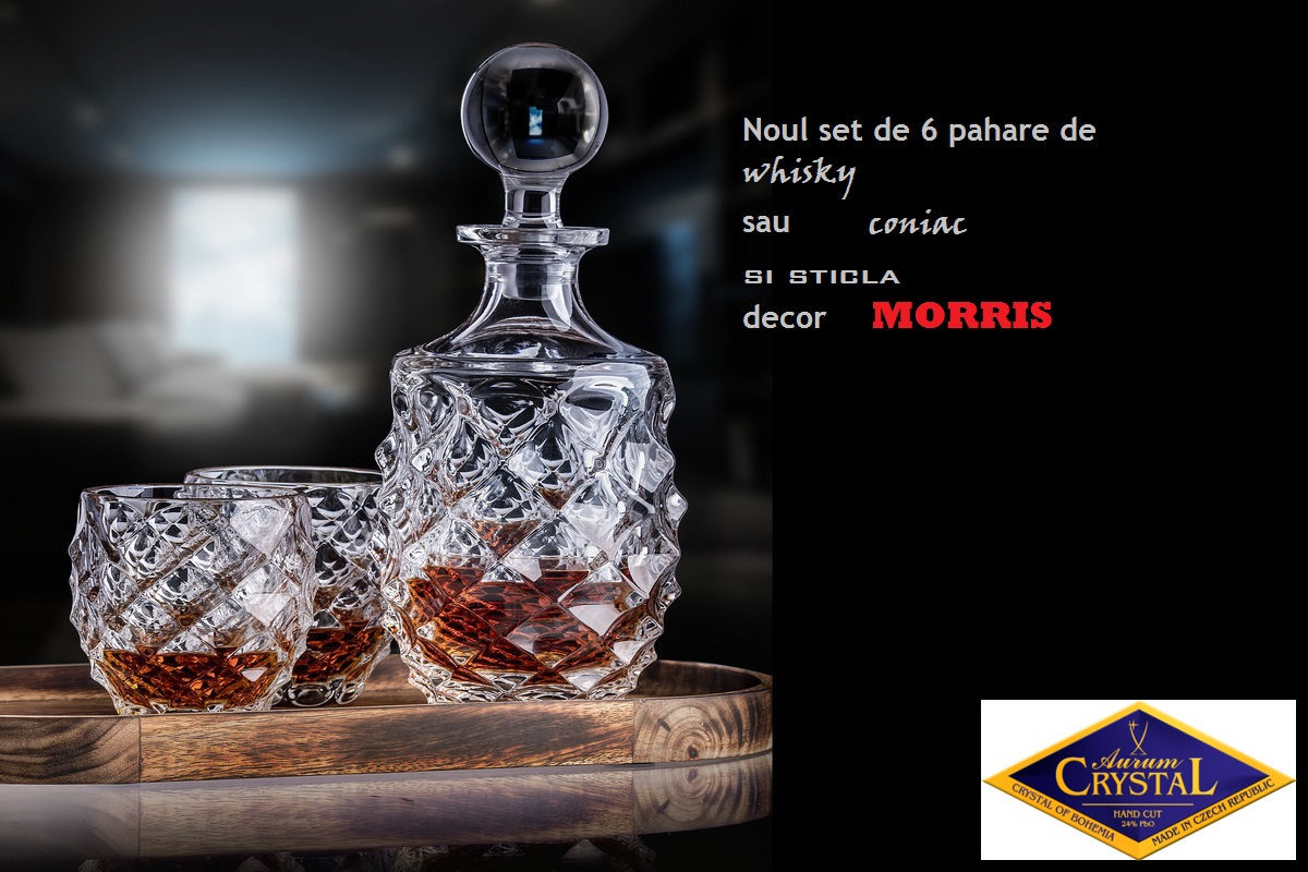 Set 6 pahare de whisky cu capacitatea de 340 ml si sticla cu capacitatea de 750 ml.Stil, eleganta si rafinament, pentru un nou model, din cristal de Bohemia autentic, 24%PbO.