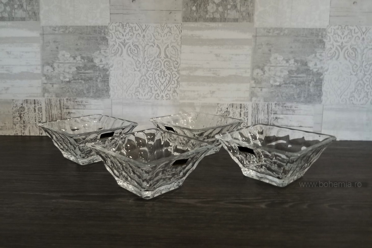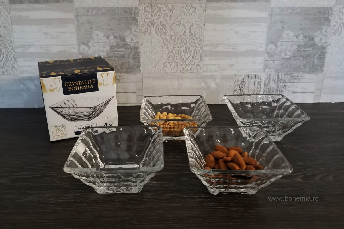 Acest set de 4 boluri patrate, cu latura de 11 cm, imbina forma moderna cu functionalitatea, devenind aliatul perfect pentru servirea aperitivelor, deserturilor sau gustarilor deosebite.
