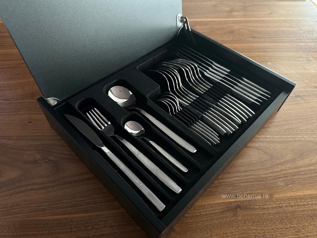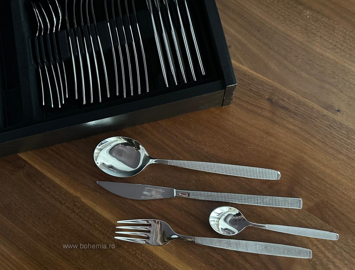 Acest set modern este ambalat într-o cutie cadou elegantă din lemn negru, reflectând un design avangardist și sofisticat. Setul include 6 cuțite, 6 linguri, 6 furculițe și 6 lingurițe, toate realizate din inox de înaltă calitate, 18/10, cu grosime de 2.5 mm.