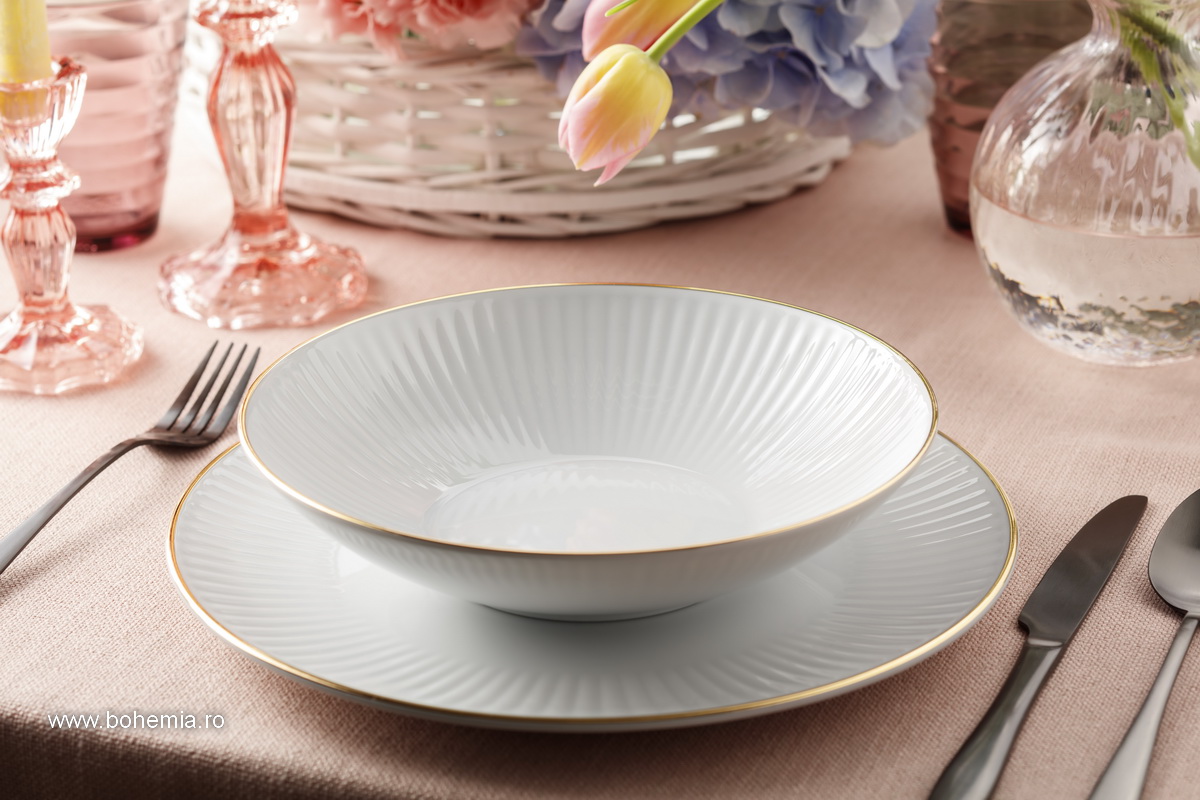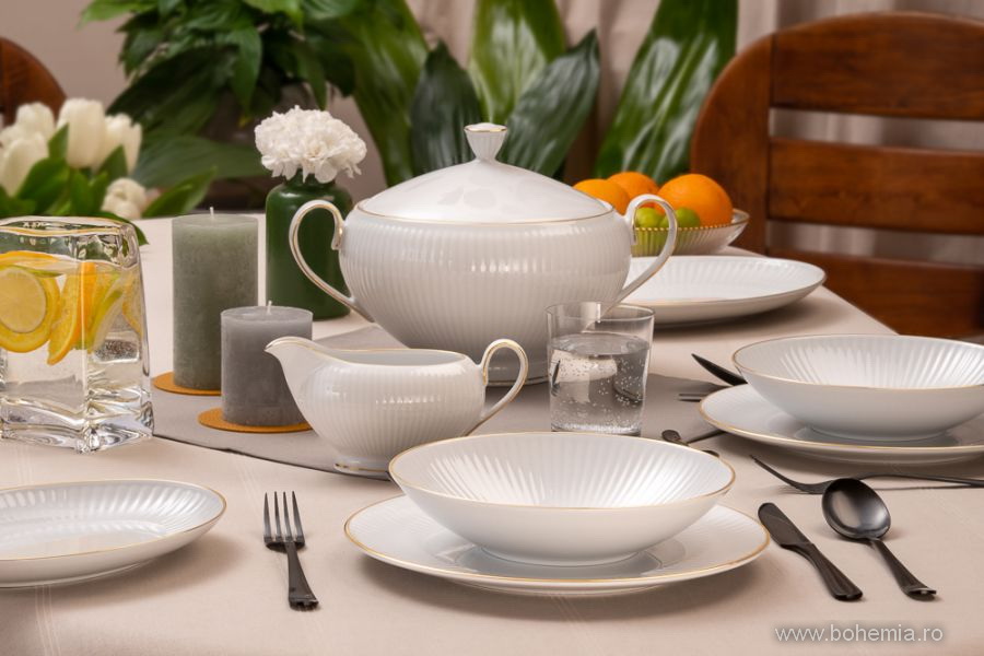 Experimentează eleganța cu setul nostru de masă Dalia din porțelan alb cu bordure fina aurie.