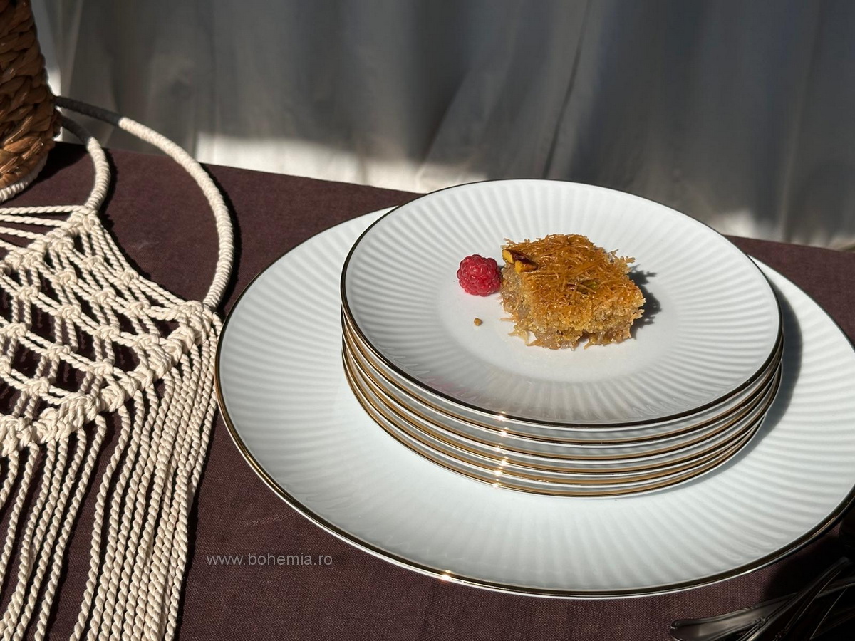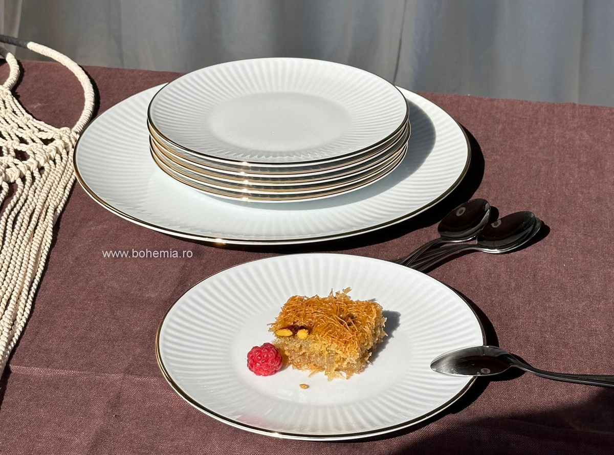 Experimentează eleganța cu setul nostru pentru desert Dalia, din porțelan alb cu bordure fina aurie.