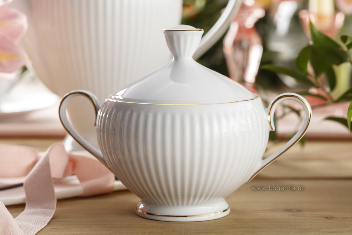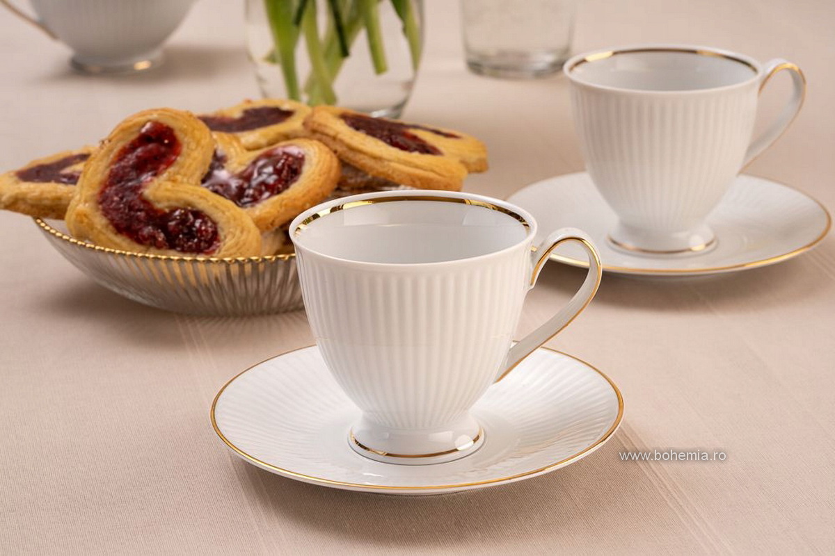 Set pentru cafea din portelan fin care contine 6 cescute cu capacitatea de 250 ml, 6 farfuriute asortate, 1 cafetiera, 1 zaharnita cu capac si 1 latiera.