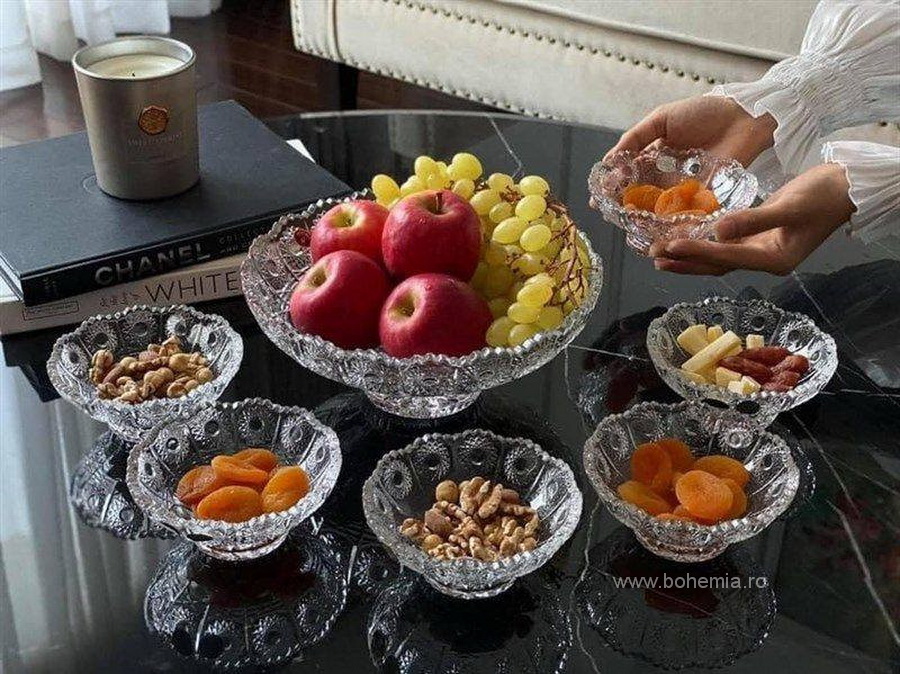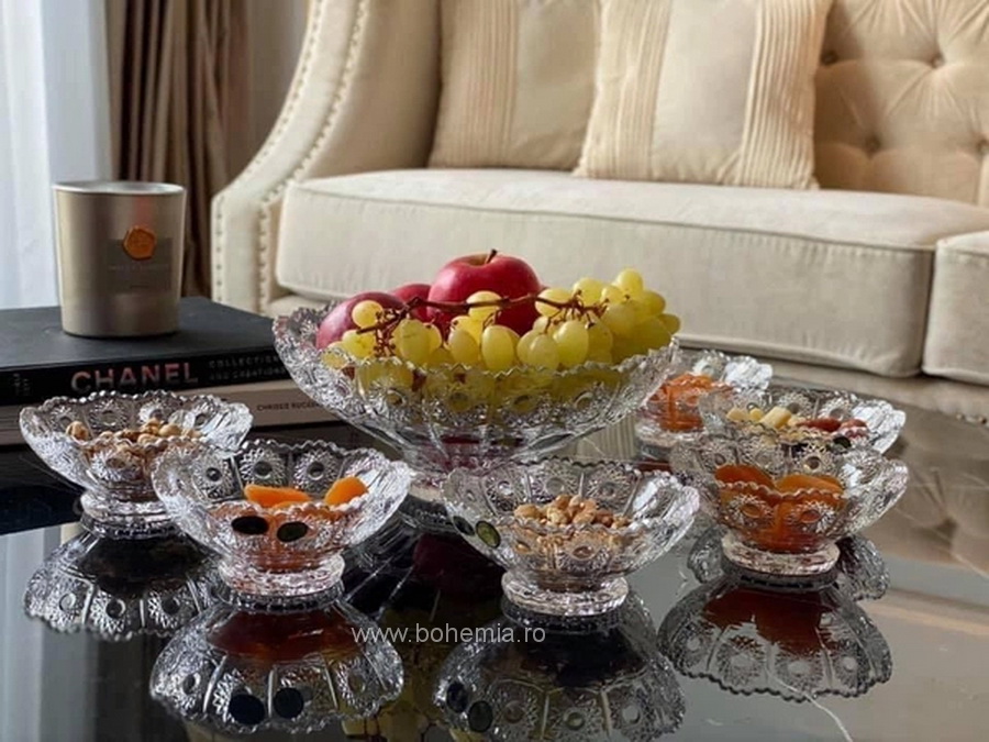 Lucratura bogata si marginea dantelata evidentiaza feminitatea acestui design, transformandu-l intr-o alegere ideala pentru momentele speciale. Descopera frumusetea atemporala a cristalului Bohemia si bucura-te de functionalitate cu un strop de glamour!