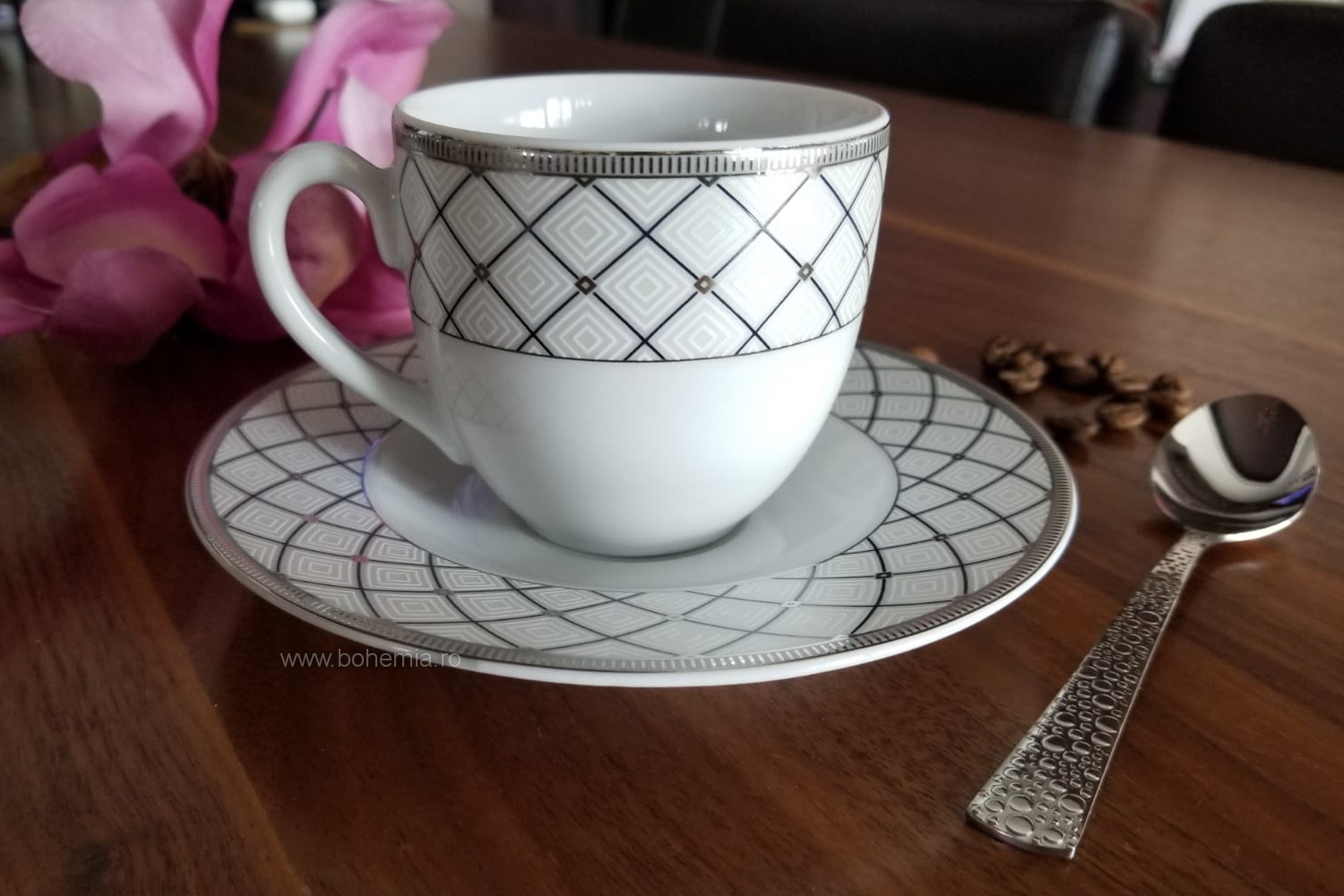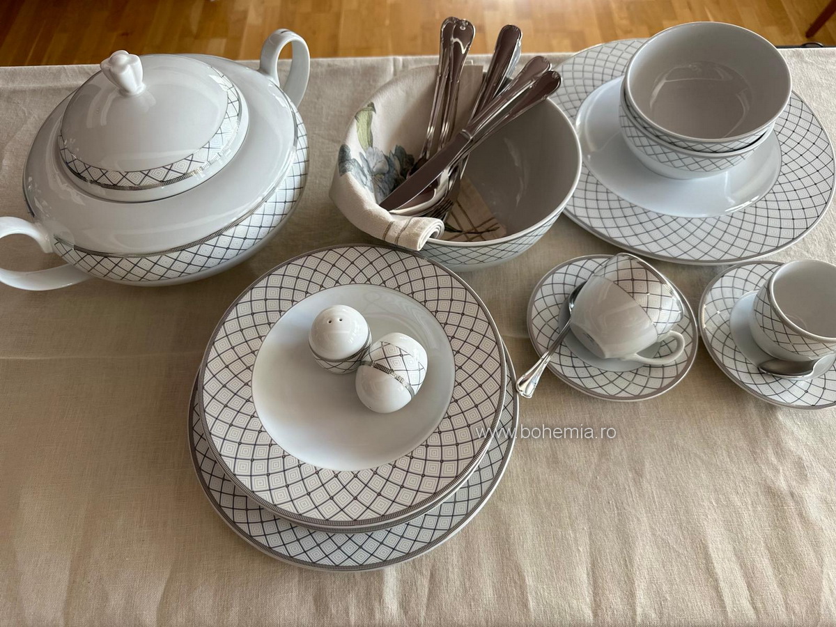 Asocierea alb-negru, argintiu-gri, este clasica si eleganta, facand ca setul Aurora sa se potriveasca perfect aranjamentelor distinse ale meselor. Totodata, intersectia jucausa ce pare un cristal intre romburilor decorului face ca setul sa capete un aer modern, chic.