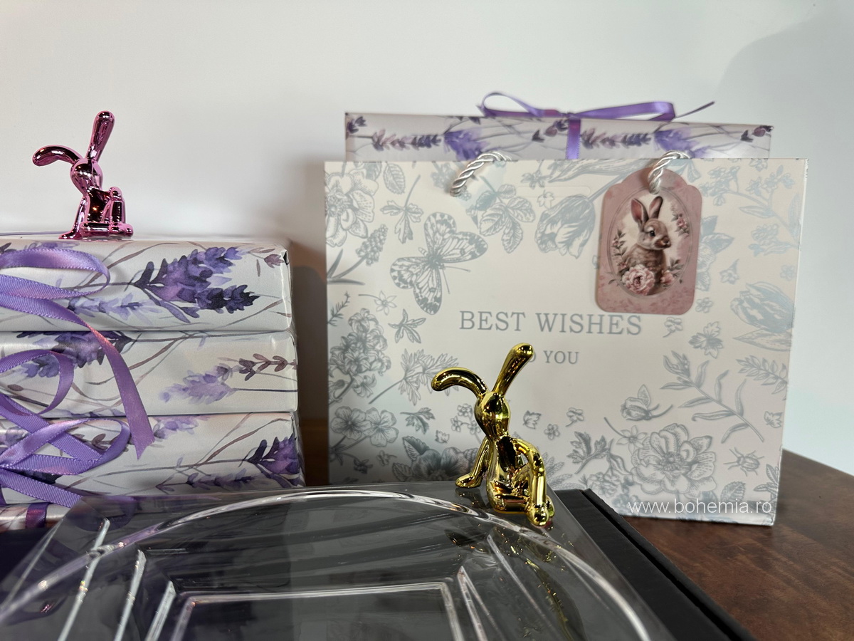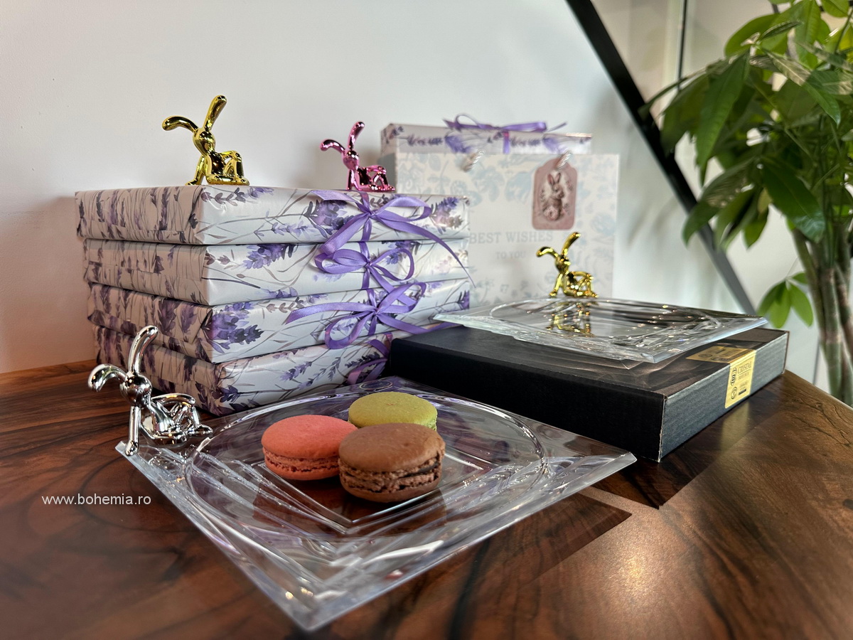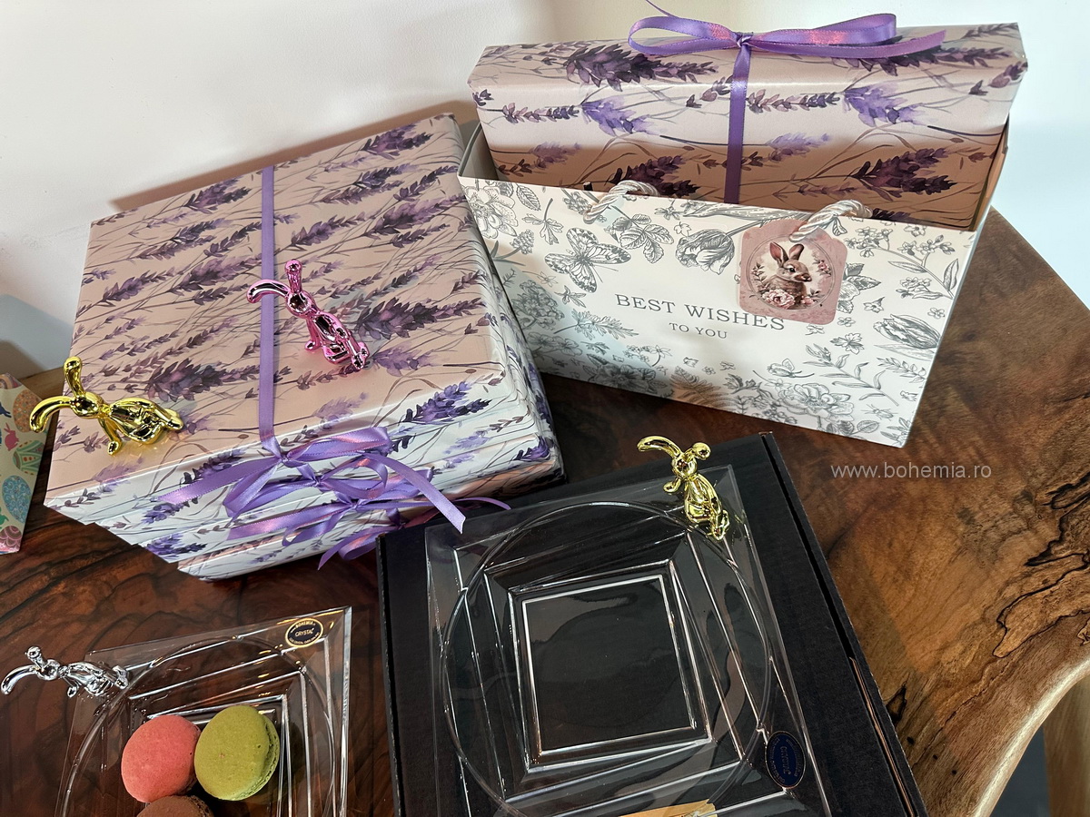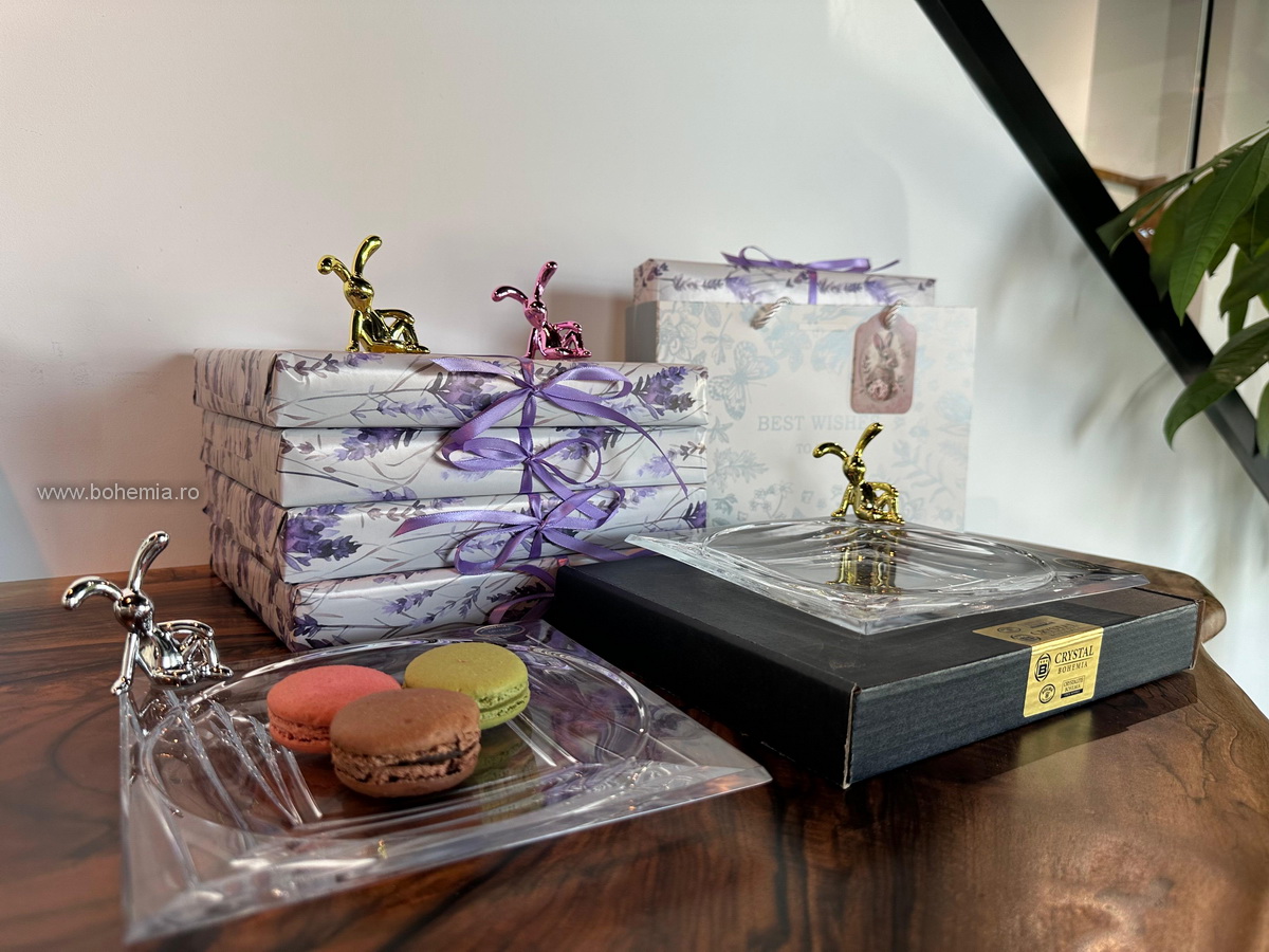 Pentru acest cadou, iepurasul este asezat intr-o punguta delicata din in, iar platoul din cristal este impachetat intr-o hartie de cadou cu decor cu levantica. Intregul ansamblu este asezat intr-o punga de cadou eleganta, tip poseta, cu o mica felicitare de sezon atasata manerului, astfel incat poate fi oferit imediat.