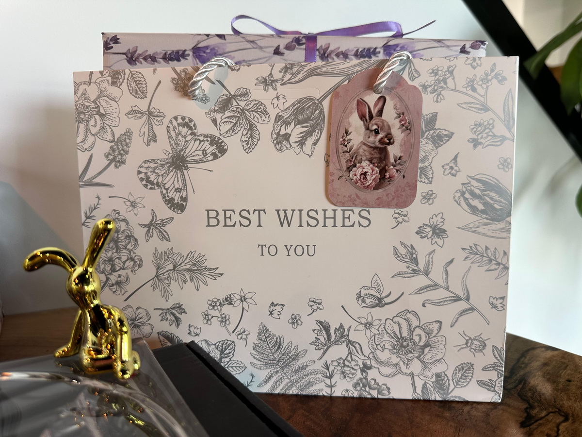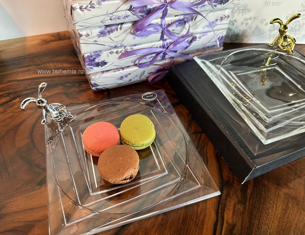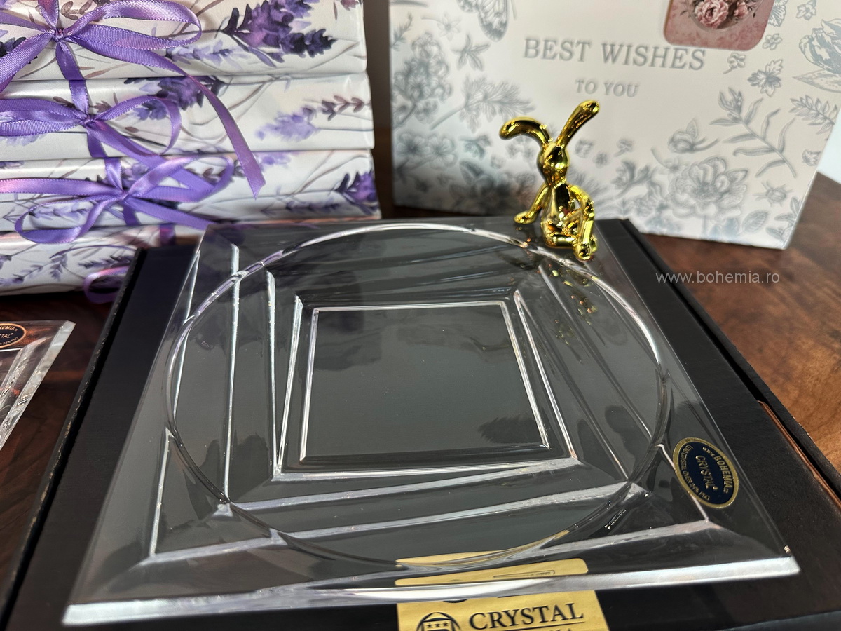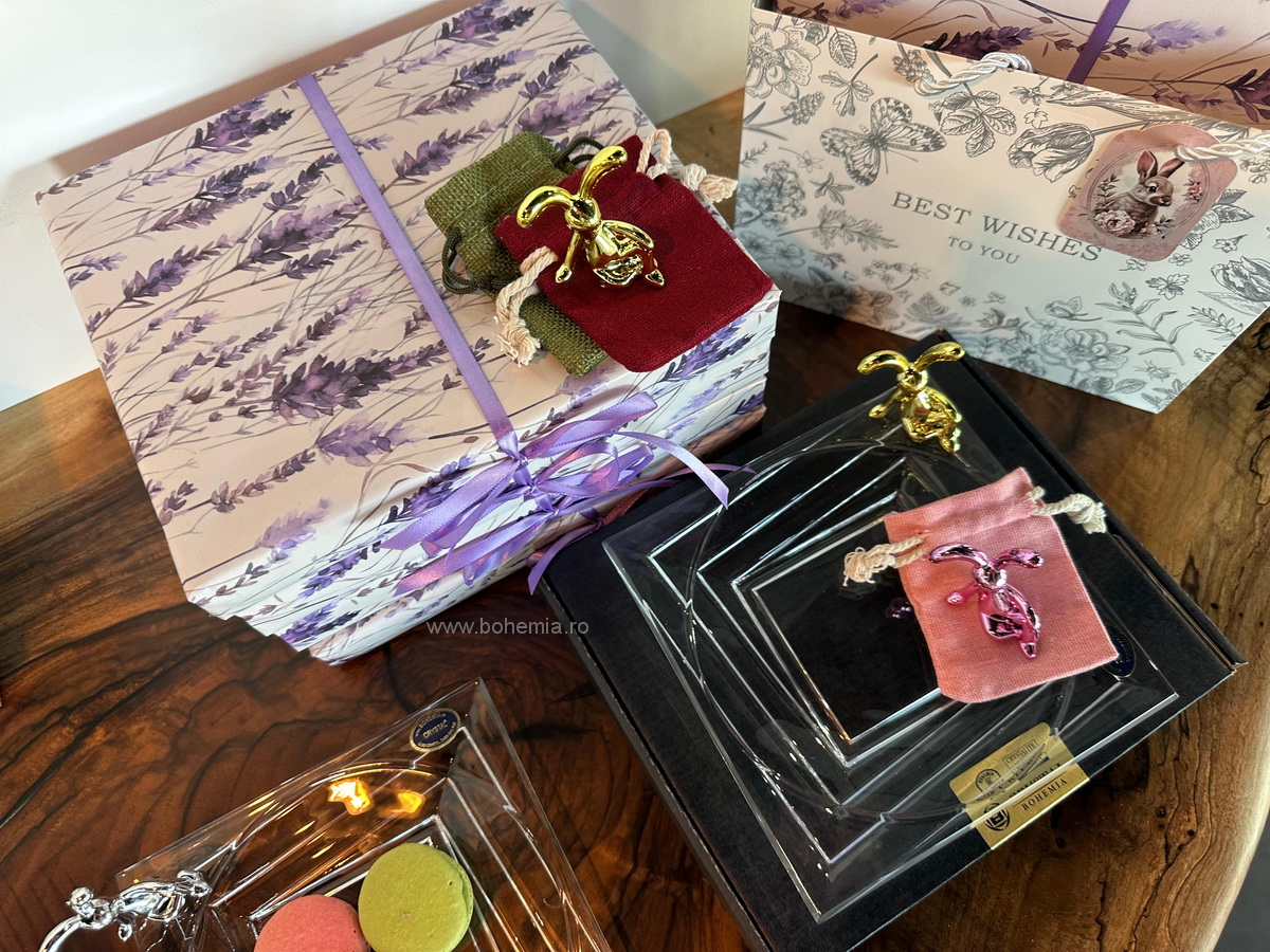 Pentru acest cadou, iepurasul este asezat intr-o punguta delicata din in, iar platoul din cristal este impachetat intr-o hartie de cadou cu decor cu levantica. Intregul ansamblu este asezat intr-o punga de cadou eleganta, tip poseta, cu o mica felicitare de sezon atasata manerului, astfel incat poate fi oferit imediat.