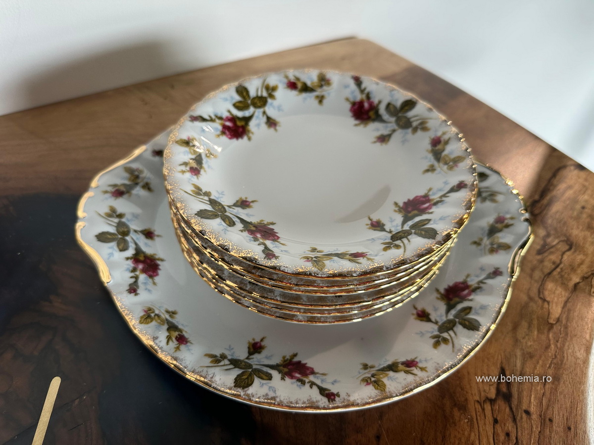 Setul contine 6 farfurii de 19 cm si un platou generos de 30 cm, toate decorate cu trandafiri rosii intensi si accente aurii bogate, cu decorare manuala, realizata cu grija pentru fiecare detaliu.